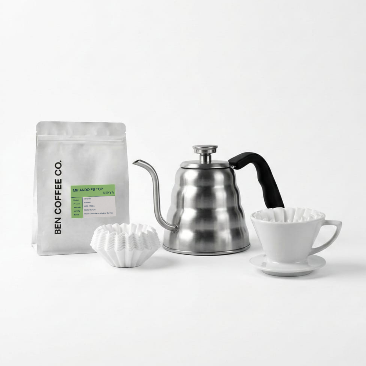 Paket içeriği:-4Brew Gooseneck Termometreli Kettle – 1.2 Lt -4Brew Flat Bottom Dripper-250g Kenya Mihando-10 adet Flat Bottom 185 Kağıt Filtre